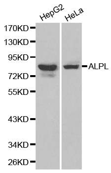There are at least four distinct but related alkaline phosphatases: intestinal, placental, placental-like, and liver/bone/kidney (tissue non-specific). The product of this gene is a membrane bound glycosylated enzyme that is not expressed in any particular tissue and is, therefore, referred to as the tissue-nonspecific form of the enzyme. Alkaline phosphatases form various dimers in vivo. This antibody can bind the four mentioned alkaline phosphatases.