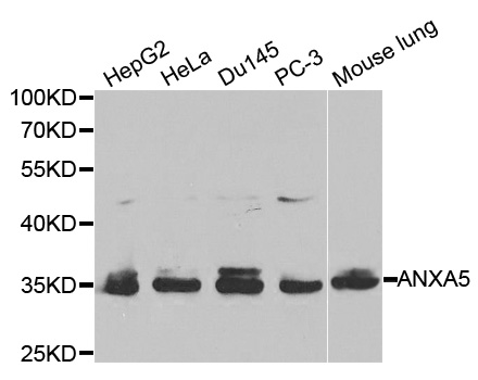 Annexin V, also known as PAP-1 or Lipocortin V, is a ~30 kDa protein that binds to phospholipids in a calcium-dependent manner (1). All annexins contain a putative PKC binding site, but only annexin V has been identified as an inhibitor of this pathway (2). It may also signal, by direct interaction withVEGFR2 receptor, in the regulation of vascular endothelial cell proliferation (3). Annexin V preferentially binds phosphatidylserine, in competition with prothrombin, leading to inhibition of blood coagulation at sites of injury preceding contact between lipid components and coagulation factors thatinitiate thrombosis (4-6). The ability of Annexin V to bind specifically and robustly to hosphatidylserine makes it an attractive reagent in detecting apoptotic cells (7). Annexin V is inducible by glucocorticoids and can be phosphorylated by tyrosine and serine/threonine kinases (8). It isthought toblockproduction of mediators of inflammation, such as prostaglandins and leukotrienes by inhibiting the release of arachidonic acid from membranes by phospholipase A2 (8).
