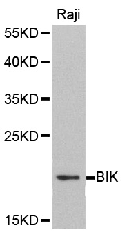 Bik/Nbk (Bcl-2-interacting killer/natural born killer) is a potent pro-apoptotic protein belonging to a group of Bcl-2 family members that includes Bad, Bid, Bim, Hrk, and Noxa, containing a BH3 domain but lacking other conserved domains, BH1 or BH2 (1,2). Functionally, Bik is able to bind to and antagonize anti-apoptotic Bcl-2 family members including Bcl-2, Bcl-xL, and viral homologs E1B-19K and EBV-BHFR1. The BH3 domain of Bik is essential for its apoptotic activity and interaction with survival proteins (3). Phosphorylation of Bik is correlated with an increase in its pro-apoptotic activity (4).
