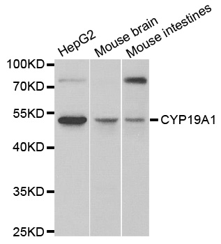 CYP19A1(Cytochrome P450 19A1) is also named as ARO1(aromatase), CYAR, CYP19, estrogen synthase and belongs to the cytochrome P450 family. It is a terminal enzyme which transforms irreversibly androgens into estrogens and it is present in the endoplasmic reticulum of numerous tissues(PMID:16406261). The gene encodes a protein with the molecular weight between 46 kDa and 69 kDa(PMID:8129748) and the protein can be glycosylated, but the level of glycosylation does not seem to be essential for CYP19A1 activity(PMID:12606587). Brain aromatase may be neuroprotective by increasing the local estrogen levels in injured neurons so that genetic variation in the brain aromatase gene may modify the risk for AD(PMID:16767510). This antibody is specific to CYP19A1.