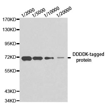 Western blot analysis of over-expressed DDDDK-tagged protein in 293T cell using DDDDK antibody at different dilution. Each lane was loaded with 2 ug cell lysate.