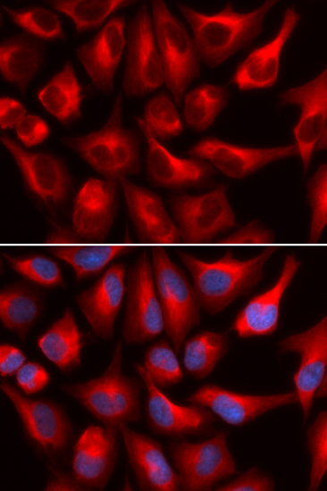 Immunofluorescence analysis of HeLa cell using DDX3X antibody. Blue: DAPI for nuclear staining.