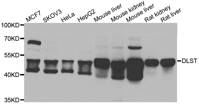 Western blot analysis of extracts of various cell lines, using DLST antibody.