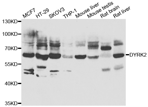 DYRK2 belongs to a family of protein kinases whose members are presumed to be involved in cellular growth and/or development. The family is defined by structural similarity of their kinase domains and their capability to autophosphorylate on tyrosine residues. DYRK2 has demonstrated tyrosine autophosphorylation and catalyzed phosphorylation of histones H3 and H2B in vitro. Two isoforms of DYRK2 have been isolated. The predominant isoform, isoform 1, lacks a 5' terminal insert.