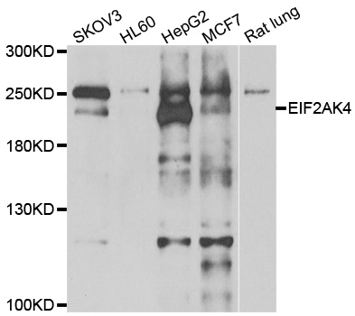 Western blot analysis of extracts of various cell lines, using EIF2AK4 antibody.