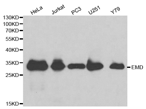 Emerin is a broadly expressed integral protein of the nuclear inner membrane (1). It contains a LEM domain and binds to several nuclear proteins, such as BAF (barrier-to-autointegration factor) and A- and B-type lamins, which are important in nuclear functions (2-5). Emerin may regulate gene expression through binding to other transcriptional regulators (6,7). Emerin binds to β-catenin and inhibits its nuclear accumulation (8). Recent studies demonstrate that Emerin is required for HIV-1 infectivity (9). Mutations in Emerin are a major cause of Emery-Dreifuss muscular dystrophy (EDMD), a disorder characterized by progressive skeletal muscle weakening (10).