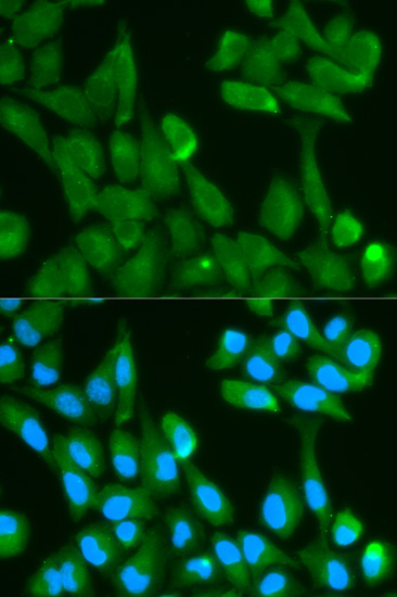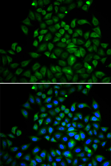 Immunofluorescence analysis of HeLa cell using FABP4 antibody. Blue: DAPI for nuclear staining.