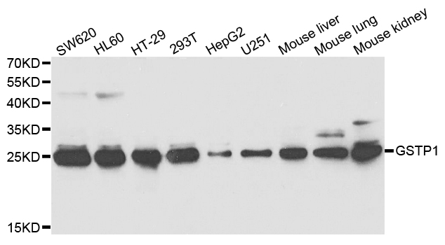 Western blot analysis of extracts of various cell lines, using GSTP1 antibody.
