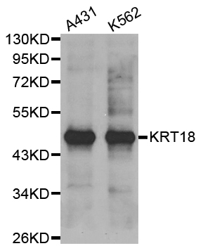 Keratins are a large family of proteins that form the intermediate filament cytoskeleton of epithelial cells. Keratin expression is highly regulated, tissue specific, and varies according to cell-state. Type I keratins consist of acidic, low molecular weight proteins with MW ranging from 40 kDa (KRT19) to 64 kDa (KRT9). Type 2 keratins consist of basic or neutral, high molecular weight proteins with MW from 52 kDa (KRT8) to 67 kDa (KRT18). KRT18, also named as CYK18, PIG46 and K18, is the most commonly found members of the intermediate filament gene family. KRT18 is a type I keratin which is found primarily in non squamous epithelia and is present in a majority of adenocarcinomas and ductal carcinomas but not in squamous cell carcinomas.