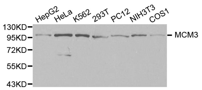 Western blot analysis of extracts of various cell lines, using MCM3 antibody.