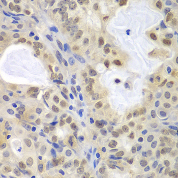 Immunohistochemistry of paraffin-embedded human oophoroma using MCM3 antibody at dilution of 1:100 (400x lens).