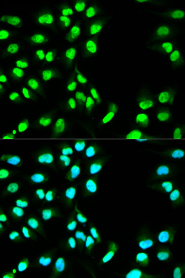 Immunofluorescence analysis of U2OS cell using MCM3 antibody. Blue: DAPI for nuclear staining.