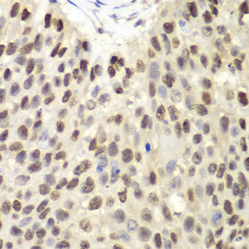 Immunohistochemistry of paraffin-embedded human lung cancer using MCM6 antibody at dilution of 1:100 (400x lens).