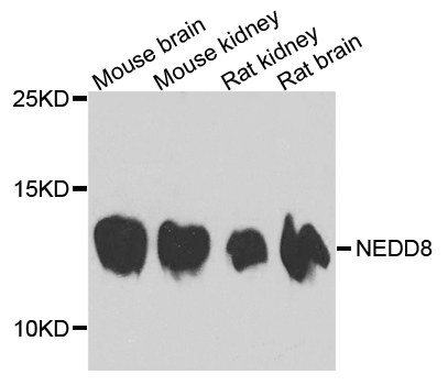 Neural precursor cell-expressed developmentally downregulated protein 8 (NEDD8), also known as Rub1 (related to ubiquitin 1) in plants and yeast, is a member of the ubiquitin-like protein family (1,2). The covalent attachment of NEDD8 to target proteins, termed neddylation, is a reversible, multi-step process analogous to ubiquitination. NEDD8 is first synthesized in a precursor form with a carboxy-terminal extension peptide that is removed by either the UCH-L3 or NEDP1/DEN1 hydrolase protein to yield a mature NEDD8 protein (3,4). Mature NEDD8 is then covalently linked to target proteins via the carboxy-terminal glycine residue in a reaction catalyzed by the APP-BP1/Uba3 heterodimer complex and Ubc12 as the E1- and E2-like enzymes, respectively (5). An E3 ligase protein, Roc1/Rbx1, is also required for neddylation of the cullin proteins (6). Protein de-neddylation is catalyzed by a number of enzymes in the cell, including a "ubiquitin-specific" protease USP21, the NEDP1/DEN1 hydrolase and the COP9/signalosome (CSN) (7,8,9). In contrast to the ubiquitin pathway, the NEDD8 modification system acts on only a few substrates and does not appear to target proteins for degradation. Neddylation of cullin proteins activates the SCF (Skp1-Cullin-F-box) E3 ubiquitin ligase complex by promoting complex formation and enhancing the recruitment of the E2-ubiquitin intermediate (10). While NEDD8 modification of VHL is not required for ubiquitination of HIF1-α, it is required for fibronectin matrix assembly (11). Mdm2-dependent neddylation of p53 inhibits its transcriptional activity (12).