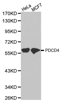 PDCD4 (programmed cell death protein 4) was identified as a suppressor of neoplastic transformation (1). It interacts with eukaryotic initiation factors eIF4AI and eIF4AII (2). PDCD4 colocalizes with eIF4A in the cytoplasm and inhibits the activity of eIF4A as an ATP-dependent RNA helicase (2). PDCD4 inhibits cap-dependent translation (2). Upon stimulation by mitogens, PDCD4 is phosphorylated on Ser67 by S6K1 kinase and then degraded through the ubiquitin pathway leading to enhanced translation and cell growth (3).