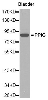 PPIG belongs to a highly conserved class of cyclophilins that function as peptidyl-prolyl-isomerases (PPIases) to catalyze the conversion of cis-proline to trans-proline in a polypeptide chain (1-4). PPIG contains an amino-terminal cyclophilin domain followed by Nopp140 repeats that are involved in its function as a nuclear chaperone (5). The carboxy-terminal of PPIG contains a SR (arginine-serine dipeptide repeat) domain (3,4) that is involved in pre-mRNA splicing and processing (6). PPIG interacts with the carboxy-terminal domain of RNA polymerase II as well as several other SR family splicing factors. These interactions lead to changes in localization and conformation and suggest a regulatory role in transcription and pre-mRNA splicing in the elongating RNA polymerase complex (7,8). PPIG is found in the nuclear matrix and nuclear speckles and is involved in the regulation of gene expression. PPIG shows a predominantly diffuse cytoplasmic distribution at the onset of mitosis, and in late telophase the isomerase is recruited to the newly formed nuclei (9).