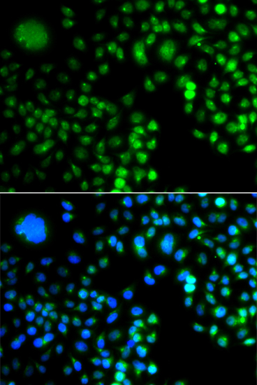 Immunofluorescence analysis of A549 cell using PRDM5 antibody. Blue: DAPI for nuclear staining.