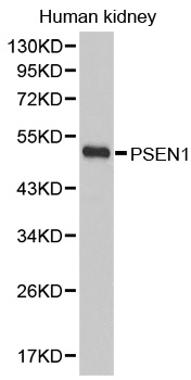Presenilin 1 and presenilin 2 are transmembrane proteins belonging to the presenilin family. Mutation of presenilin genes has been linked to early onset of Alzheimer disease, probably due to presenilin's associated γ-secretase activity for amyloid-β protein processing (1,2). Endogenous presenilin mainly exists in a heterodimeric complex formed from the endoproteolytically processed amino-terminal (34 kDa) and carboxy-terminal (~20, 22, 23 kDa) fragments (CTF) (2,3).
