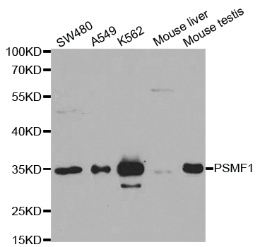 The 26S proteasome is a multicatalytic proteinase complex with a highly ordered structure composed of 2 complexes, a 20S core and a 19S regulator. The 20S core is composed of 4 rings of 28 non-identical subunits; 2 rings are composed of 7 alpha subunits and 2 rings are composed of 7 beta subunits. The 19S regulator is composed of a base, which contains 6 ATPase subunits and 2 non-ATPase subunits, and a lid, which contains up to 10 non-ATPase subunits. Proteasomes are distributed throughout eukaryotic cells at a high concentration and cleave peptides in an ATP/ubiquitin-dependent process in a non-lysosomal pathway. An essential function of a modified proteasome, the immunoproteasome, is the processing of class I MHC peptides. This gene encodes a protein that inhibits the activation of the proteasome by the 11S and 19S regulators. Alternative transcript variants have been identified for this gene.