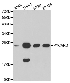 TMS1 (target of methylation-induced silencing)/ASC (apoptosis-associated speck-like protein containing a CARD), also referred to as PYCARD and CARD5, is a 22-kDa pro-apoptotic protein containing an N-terminal pyrin domain (PYD) and a C-terminal caspase recruitment domain (CARD) (1-2). The TMS1 gene was originally found to be aberrantly methylated and silenced in breast cancer cells (2), and has since been found to be silenced in a number of other cancers, including ovarian cancer (3), glioblastoma (4), melanoma (5), gastric cancer (6), lung cancer (7), and prostate cancer (8). Expression of TMS1 can be induced by pro-apoptotic/inflammatory stimuli (9). During apoptosis TMS1 is re-distributed from the cytosol to the mitochondria and associates with mitochondrial Bax to trigger cytochrome c release and subsequent apoptosis (10). TMS1 has also been found to be a critical component of inflammatory signaling where it associates with and activates caspase-1 in response to pro-inflammatory signals (11).