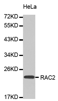 RAC2, also named as GX, belongs to the small GTPase superfamily and Rho family. RAC2 is a plasma membrane-associated small GTPase which cycles between an active GTP-bound and inactive GDP-bound state. In active state binds to a variety of effector proteins to regulate cellular responses, such as secretory processes, phagocytose of apoptotic cells and epithelial cell polarization. RAC2 augments the production of reactive oxygen species (ROS) by NADPH oxidase. Defects in RAC2 are the cause of neutrophil immunodeficiency syndrome. The antibody is specific to RAC2.