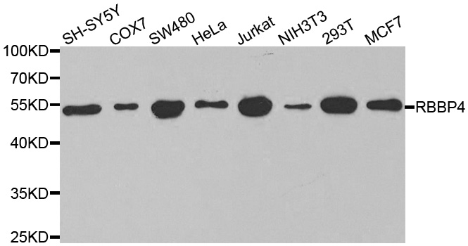 Western blot analysis of extracts of various cell lines, using RBBP4 antibody.