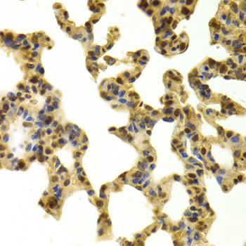 Immunohistochemistry of paraffin-embedded mouse lung using RBBP4 antibody at dilution of 1:100 (x400 lens).