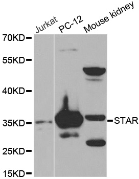 Steroidogenic acute regulatory protein (StAR) plays a significant role in cholesterol transport from the cytoplasmic outer membrane to the inner mitochondrial membrane (1). The 37 kDa precursor is cleaved to generate an active 28 kDa protein capable of facilitating cholesterol metabolism into pregnenolone (2,3). StAR is prevalently expressed in mitochondria of steroid-producing adrenal and gonadal tissue (3). Abnormalities in StAR gene expression are impacted in autosomal Lipoid Congenial Adrenal Hyperplasia (LCAH) resulting in defects in pregnenolone and cortisol synthesis (4). The mechanism of cholesterol binding to StAR has yet to be elucidated (4).