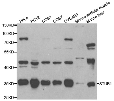 The carboxy terminus of Hsc70-interacting protein (CHIP, STUB1) is a co-chaperone protein and functional E3 ubiquitin ligase that links the polypeptide binding activity of Hsp70 to the ubiquitin proteasome system (1). Cytoplasmic CHIP protein contains three 34-amino acid TPR (tetratricopeptide repeat) domains at its amino terminus and a carboxy-terminal U-box domain. CHIP interacts with the molecular chaperones Hsc70-Hsp70 and Hsp90 through its TPR domain, while E3 ubiquitin ligase activity is confined to the U-box domain (2,3). The binding of CHIP to Hsp70 can stall the folding of Hsp70 client proteins and concomitantly facilitate the U-box dependent ubiquitination of Hsp70-bound substrates (4-6). CHIP appears to play a central role in cell stress protection (7) and is responsible for the degradation of disease-related proteins that include cystic fibrosis transmembrane conductance regulator (4), p53 (8), huntingtin and Ataxin-3 (9), Tau protein (10), and α-synuclein (11).
