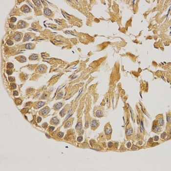 Immunohistochemistry of paraffin-embedded rat testis using SUMO1 antibody at dilution of 1:200 (x400 lens).
