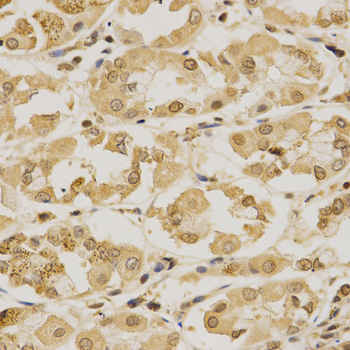 Immunohistochemistry of paraffin-embedded human stomach using SUMO1 antibody.
