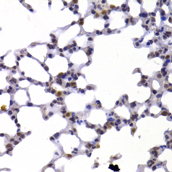 Immunohistochemistry of paraffin-embedded mouse lung using SUMO1 antibody at dilution of 1:100 (x400 lens).