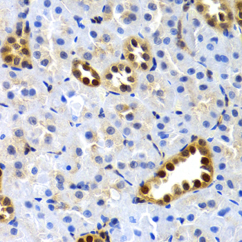 Immunohistochemistry of paraffin-embedded rat kidney using SUMO2 antibody at dilution of 1:200 (400x lens).