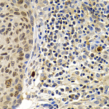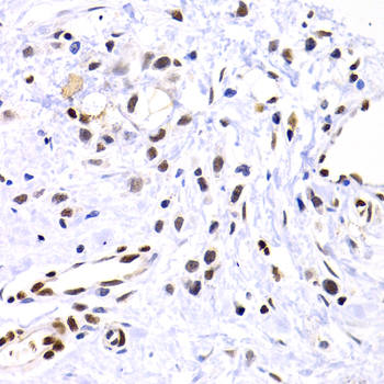 Immunohistochemistry of paraffin-embedded human lung cancer using SUMO2 antibody at dilution of 1:200 (400x lens).