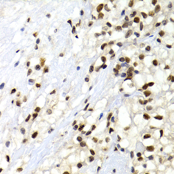 Immunohistochemistry of paraffin-embedded human kidney cancer using SUMO2 antibody at dilution of 1:200 (400x lens).