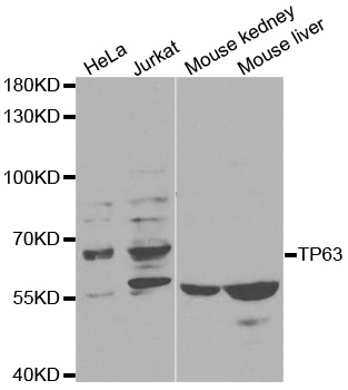 The p53 tumor suppressor protein plays a major role in cellular response to DNA damage and other genomic aberrations. Activation of p53 can lead to either cell cycle arrest and DNA repair or apoptosis (1). In addition to p53, mammalian cells contain two p53 family members, p63 and p73, which are similar to p53 in both structure and function (2). While p63 can induce p53-responsive genes and apoptosis, mutation of p63 rarely results in tumors (2). Amplification of the p63 gene is frequently observed in squamous cell carcinomas of the lung, head and neck (2,3). The p63 gene contains an alternative transcription intiation site that yields a 40 kDa deltaNp63 lacking the transactivation domain, and alternative splicing at the carboxy-terminus yields the alpha, beta and gamma isoforms (3,4).