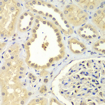 Immunohistochemistry of paraffin-embedded human kidney using ZNF346 antibody at dilution of 1:100 (x400 lens).