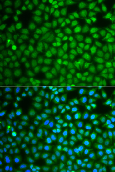 Immunofluorescence analysis of A549 cell using ZNF346 antibody. Blue: DAPI for nuclear staining.